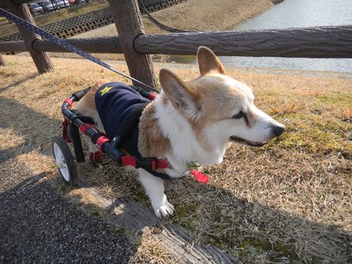 可哀相だけど、車椅子のおかげで、今までと変わらずお散歩出来ています。